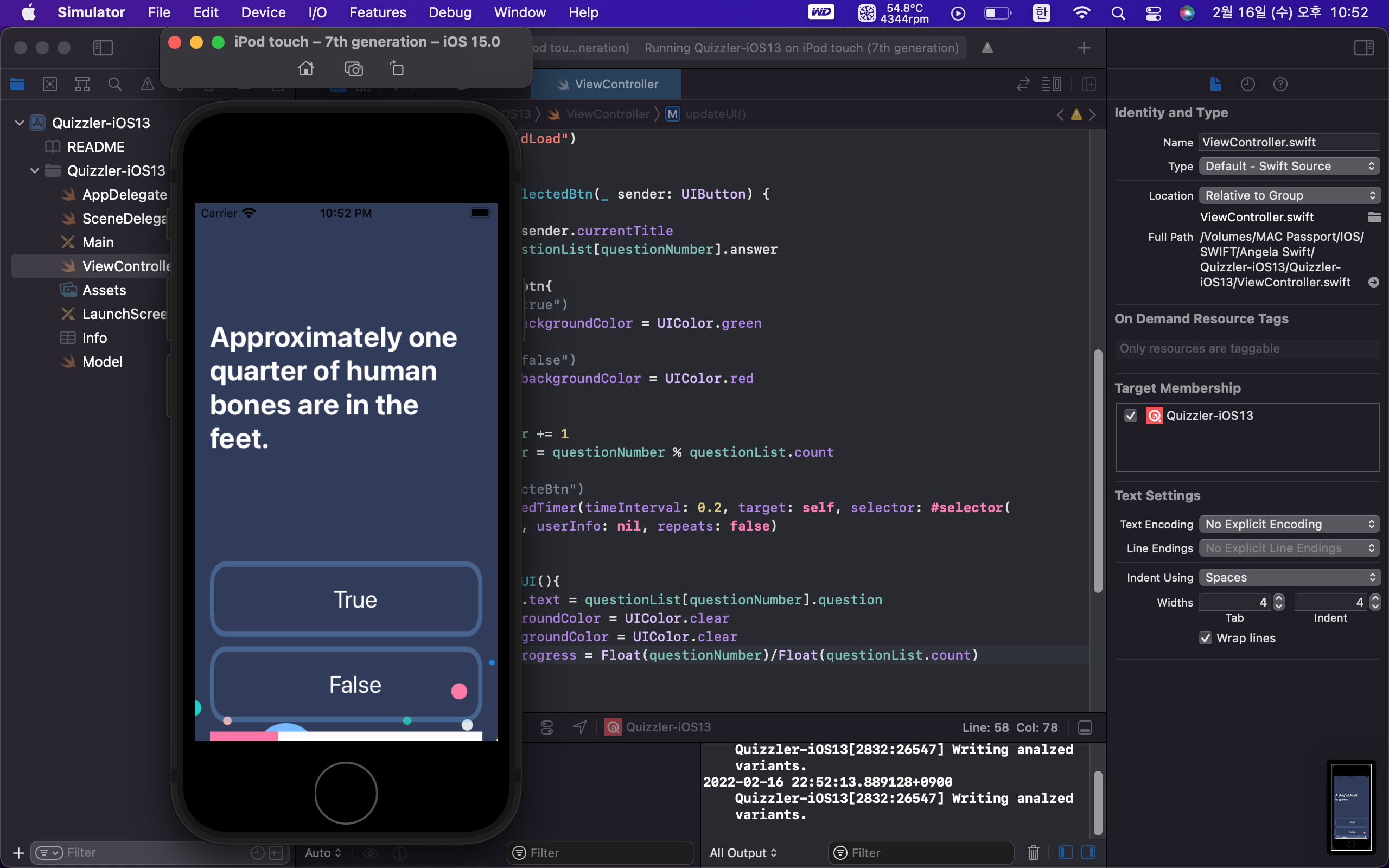 let btn = quiz.quizAnswer(select)//Model에 있는 글자와 비교하여 True, False 리턴하게 만들었습니다