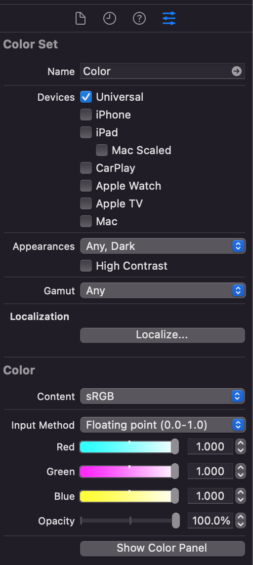 5. Appearances 칸에서 Any,Light,Dark를 선택하여 색상을 넣어준다.