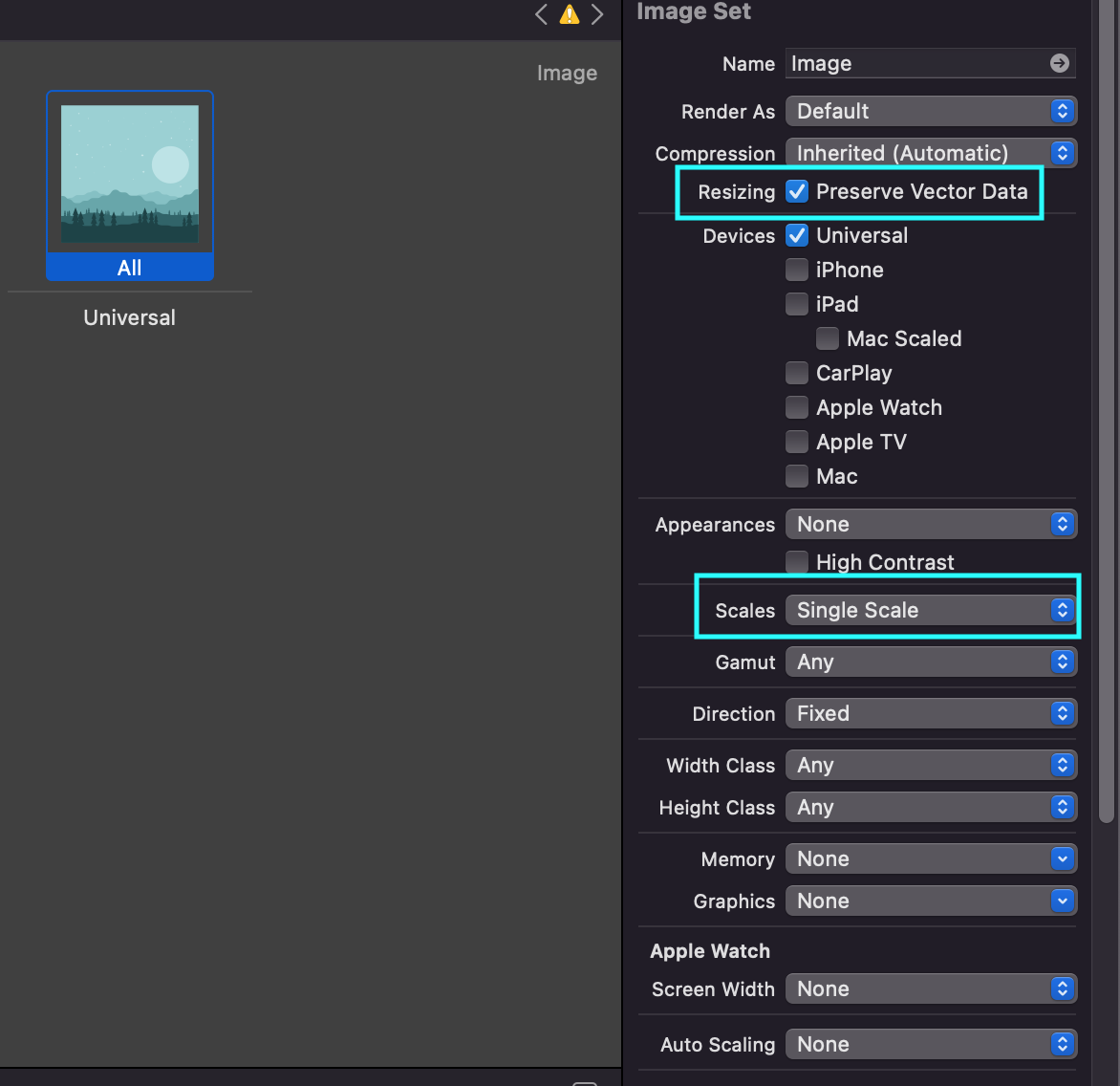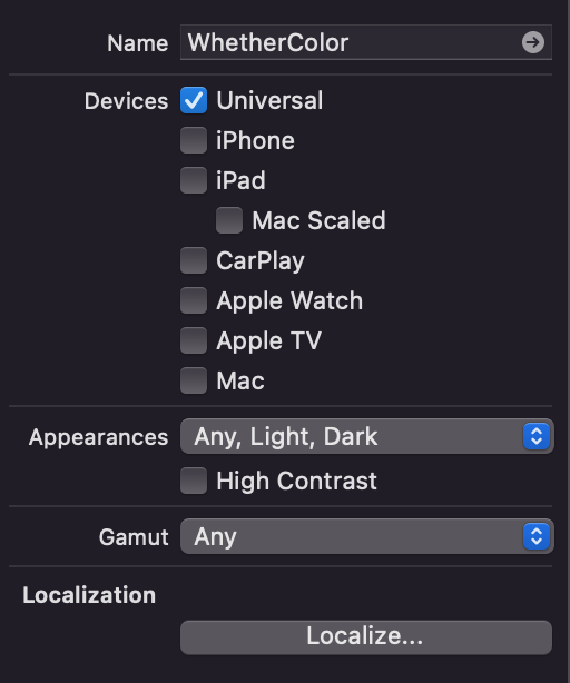 4. Appearances에 Any,Light,Dark를 선택하여 만들어 준 후에 맞는 사진을 넣어준 후에 Name에 id를 적어준다.