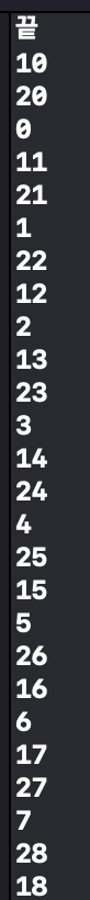 위에 있는 시간이 멈추고 print하였던 index 번호가 끝날 때까지 기다리다가 끝이라는 단어와 같이 나오게 됩니다.