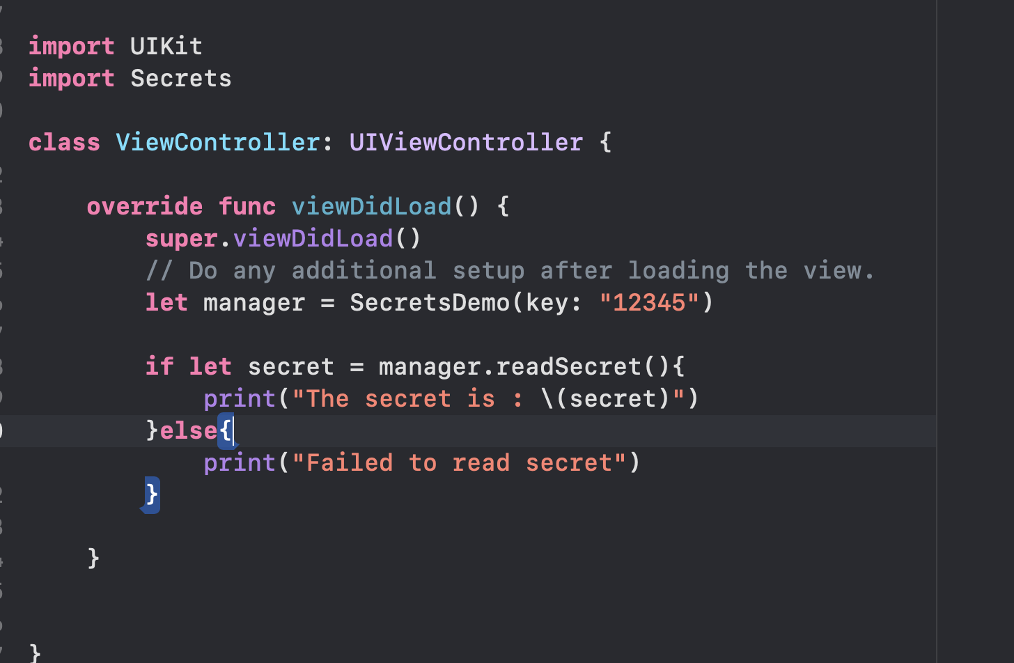 위와 같이 적어주었다. 대략 설명을 하면 SecretsDemo를 init하면서 해당 key값과 동일하다면 readSecret()하면 문구가 나오는 로직을 작성하였다.