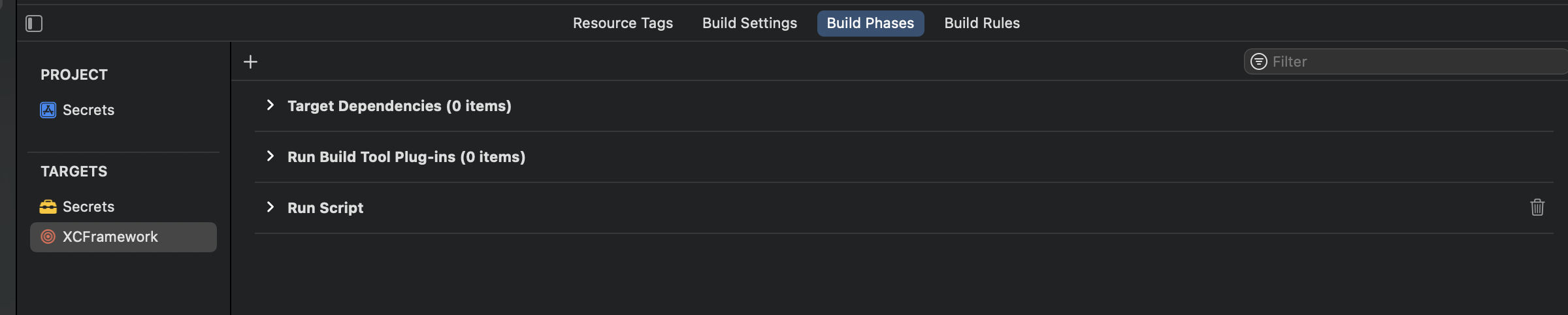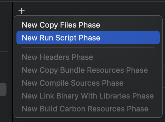 XCFramework가 만들어 졌으면 만들어진 target을 클릭하여 Build Phases를 누르고 '+'를 클릭한다.