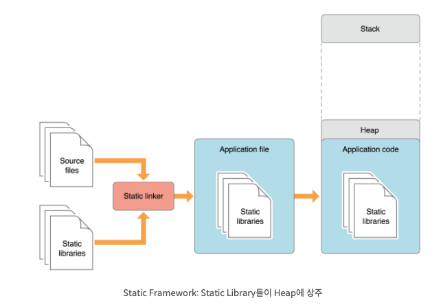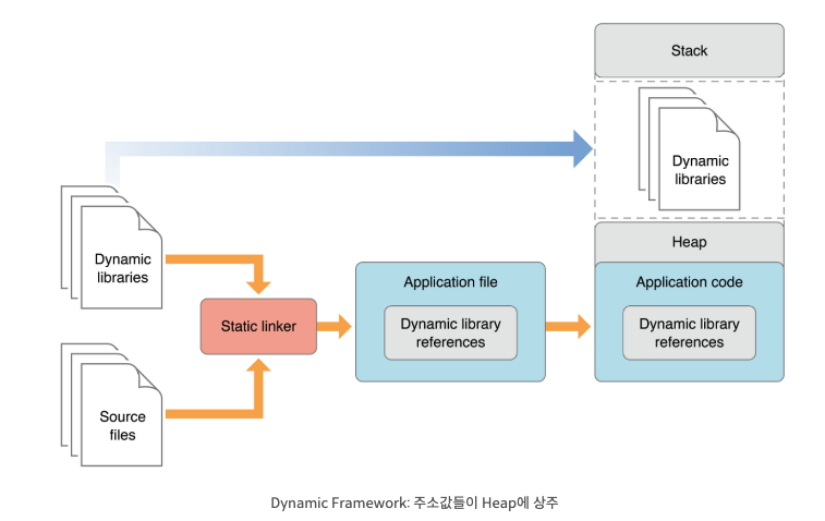 - 위의 그림에서 보듯이 Static Linker를 통해 Static Library 코드가 어플리케이션 코드 내로 들어가 Heap 메모리에 상주하게 됩니다. 따라서 Static Library가 복사되므로, Static Framework를 여러 Framework에서 사용하게 되면 코드 중복이 발생하게 됩니다.